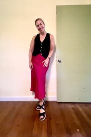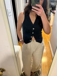 I really like the navy linen fabric of this vest. I initially tried to wear without a shirt under it, but the neckline gapes a little on me. Overall really loved and got lots of compliments.