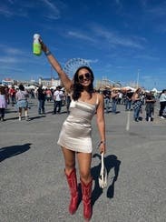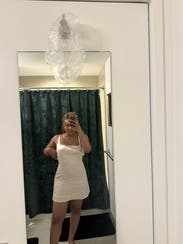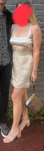 Wore this as my “white” outfit for Backstreet Boys at the Sphere in Vegas. It’s a very cute dress. I can understand that some might not like where the bust line cuts, but it’s intended to be an empire waist alà Bridgerton. I did have to adjust my boobs to get them to sit right, but otherwise no issues. The material is really soft and the color is a silvery gold that’s actually pretty subtle. Styled with Nikes.