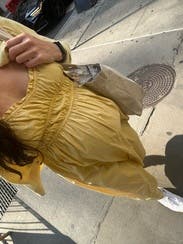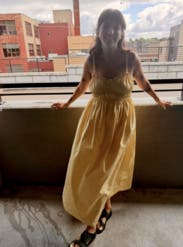 Easy Yellow Poplin dress. Runs a little bit large, very stretchy in the waist and bust. Non-adjustable straps. The straps were a little loose on me, but bc of the elastic hem around the bust everything stayed put. Wore this 2x, once casual throw on with no bra, and one time for dinner with a strapless bra.