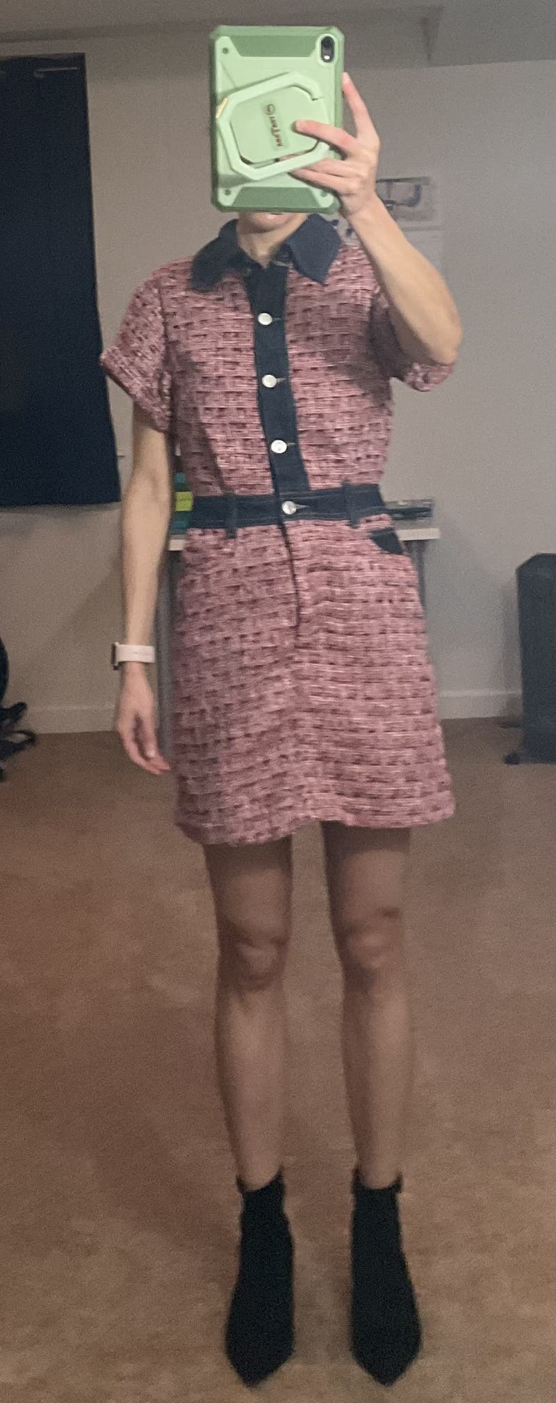 Pink plaid & check (30% Cotton, 30% Acrylic, 30% Polyester, 10% Viscose). Casual Dress. Collared. Short Sleeve. Front button closure. Shoulder to hemline length: 33.5". Imported.
