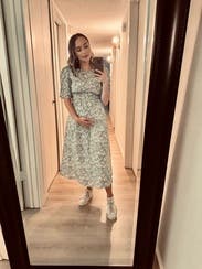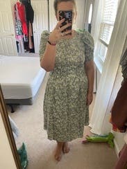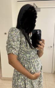 I wore this last year non-pregnant, and this year 24-26 weeks pregnant in the same size and it fit both times and felt flattering and comfortable, which feels kinda miraculous. Good dress for church or baby shower type things.