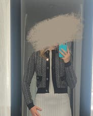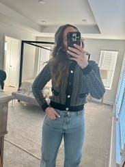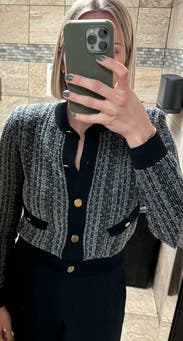 I loved this cardigan. The first one I received had really mushed up in a ball shoulder pads that wouldn’t flatten. RTR customer service was GREAT. I needed it to travel the next day and they got a new one to me. Which was also good because I realized the silver buttons had very scratched up faces. The new one was much better. Debating buying this piece.