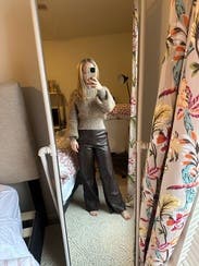 I liked the sweater and its dramatic sleeves. But, it’s definitely heavy and a bit scratchy. Love the drop shoulders for my small frame. Keep in mind the silver sparkles are prominent.