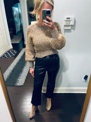 Cute sweater with a fun shape. Lots of compliments. Hints of shiny gold that make it festive. A little too cropped to wear for work, but I put a tank underneath.