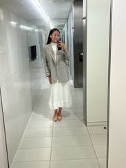 Gorgeous grey blazer for work — the photos show a much lighter/more beige color. It’s a true light grey. Fits perfectly! Arms fit like a normal blazer would with an oversized body which keeps me warm in the office all day.
