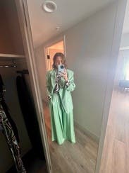 Renting the “matching” pants, couldn’t make those work at all (too long, too tight in the waist, satin material). Wore this blazer once or twice, the color was nice, recommended sizing down