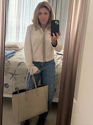 this tweet jacket is perfect to wear during the day to give any pair of jeans an elevated classy look. It was perfect for a fall festival at the beach. It was warm enough that I didn’t need another jacket over it and the color combination gives it a lot of versatility to wear with the most the FAUX leather collar and detailing down the center give this jacket something extra. I also carried the boss tote with it, which matched perfectly. One warning size down if you want more fitted look. I got a size 4 and had plenty of room. I am usually a size 6 in blazers and jackets.