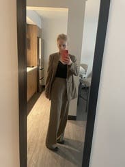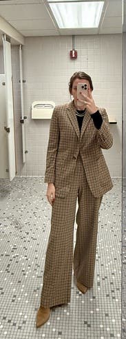 Wore the suit set for a winter work function and loved how comfortable I was all day. The softness and stretch of the fabric almost felt like I was getting away with wearing pjs in public, but everything held it's shape. The pants were a little long and slightly baggy, but I wore heeled boots to compensate. The jacket was great.