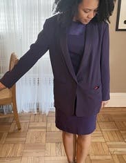 Love, love, love this! I received so many compliments on this blazer! It has a sleek, classic look. It is true to size and is a lightweight fabric. The color is a deep, rich purple. I may buy this one. :)