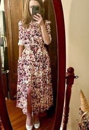 A fun work dress. Loved the splatter and flower style. Side slits go above the knee on each side. Buttons did not flair