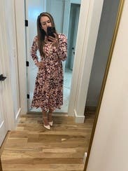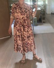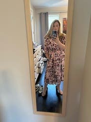 I didn’t like this dress. The print is lovely but that’s it. I sized down and it was still huge on me. The belt is sewn into the dress so you can take it off and it was super lopsided, unless you want to do a super unflattering side tie. I ended up pinning in together to give me some shape.