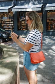 Great Crossbody- Fits a ton of things- including essentials like my phone, wallet, lipstick but also fit a notepad and other knick knacks. Beautiful orange-y-red pop of color, thick strap so was great for running errands on a long day outside!