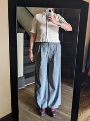 Did not wrinkle despite many hours folded in a suitcase. Very lightweight and great alternative to linen in warmer weather. Light grey and white pattern with pleats and small accent pocket were current but nothing particularly special - just a solid basic wide leg pant. TTS. I had plenty of room but not so much I’d want to size down. Definitely sit at your waist. Four stars because, like others, I found these are unexpectedly short. I’m 5’7” and wearing flats in this picture - anyone taller will struggle. Hem also has less than an inch to let out if you were contemplating purchasing.
