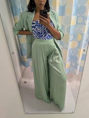 I got lots of compliments on this set, however it wrinkles so bad! The pants are definitely long but, at 5’10, anything higher than a kitten heel made them too short. Fun fun!