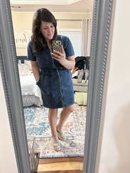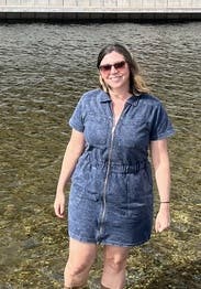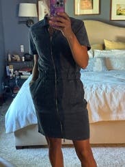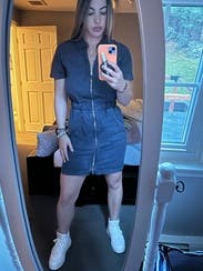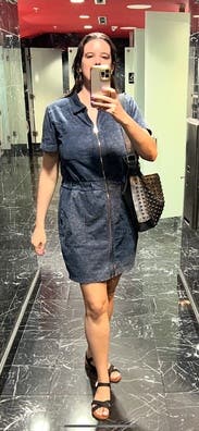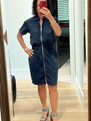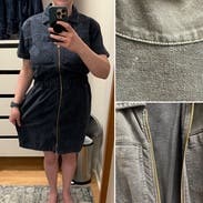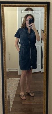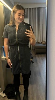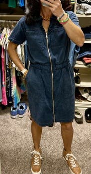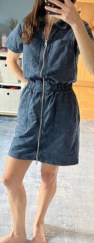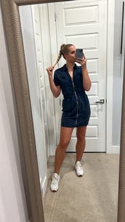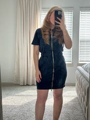 Cute little dress! Comfortable, true to size. Didn’t end up wearing this because it wasn’t my style, didn’t love the zipper down the middle and hugged my hips just a little too much but it fit perfectly. It’s a really soft denim with an acid wash look. Loved the cinched waist and also not too short. Cute dress for dinner with friends or just running around, more of a casual look that you could wear with sneakers or sandals.