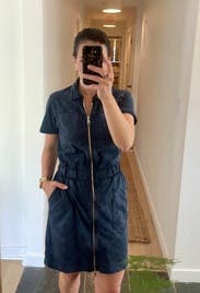 This BOSS denim dress offers a casual yet polished look with its structured collar and cinched waist. Pair it with a cream cardigan for a relaxed vibe or dress it up with sleek heels and statement jewelry.