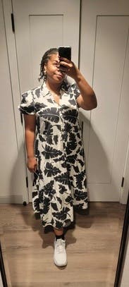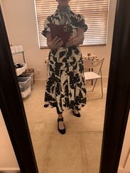 Easy work dress and received so many compliments. Could have ordered a medium but the large was nice a roomy and flowy. Would rent again!