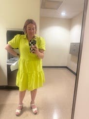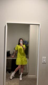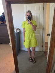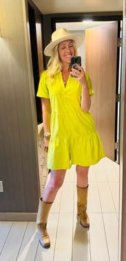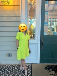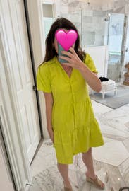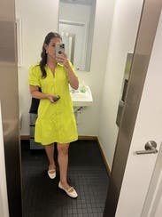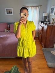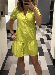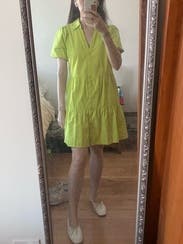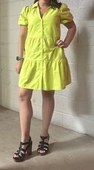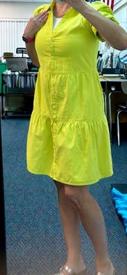 Love this dress. Easy to wear, no pinching or pulling anywhere. Neckline is not too low and it’s youthful without being too short. Color is just sunny and fun. Chartreuse.