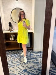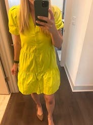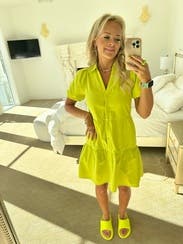 LOVED this dress! Light and airy, comfortable. Wore it multiple times with tennis shoes, sandals and wedges for a variety of looks. Color is “highlighter yellow”, not neon but a chartreuse yellow.