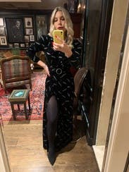 This dress is AMAZING. The huge shoulder pads create a slimming effect for the rest of the dress and it is super comfortable. A previous renter had left a safety pin in just the right spot to keep the slit from opening to the waist. It’s sassy, fun and made me feel good, all wins!