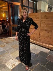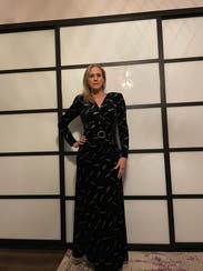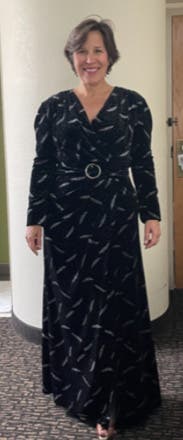 This was my second choice. It fit well but the slit is VERY high and I was going to a work event so I didn't wear it. The ruching on the sleeves is very dramatic and I thought it looked better with shoulder pads. The shorter length worked well as it was floor length for me.