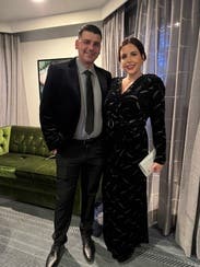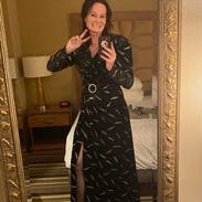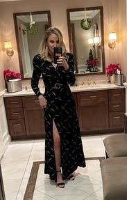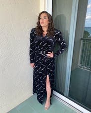 I'm obsessed with this Bronx and Banco number! I wore to a formal wedding event and got so many compliments. Things to note - the slit is high, the sizing runs a bit big and the shoulder pads are intense. Overall I loved the 80s velvet vibe of this dress and it was extremely comfortable all night long. Only downside is that the black dye from the dress rubbed off on my skin and nails.... minor issue for a dazzling/different dress. Would definitely recommend renting!