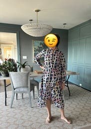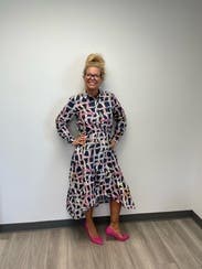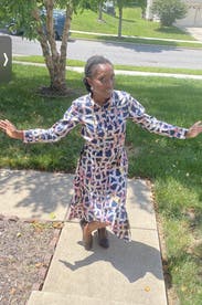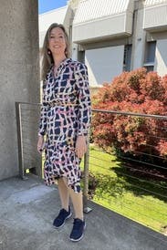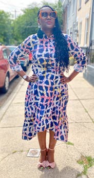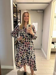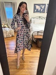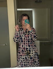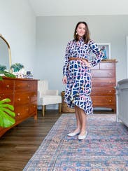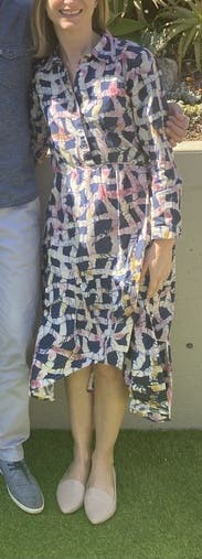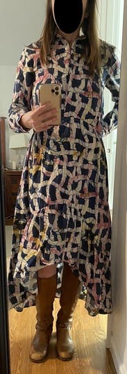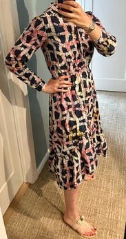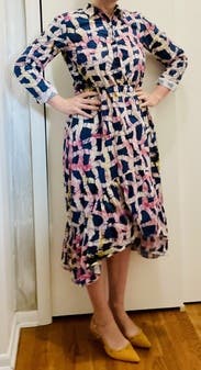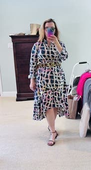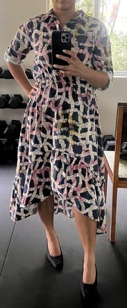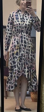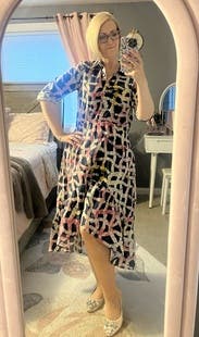 I rented this dress twice because I loved it so much. I wore it once to an Easter party that I hosted in my backyard and again to my daughter's outdoor elementary school graduation. The pattern and the uneven hem add excited to what could be be perceived as a boring and basic shirt dress. It fit perfectly and was flattering.
