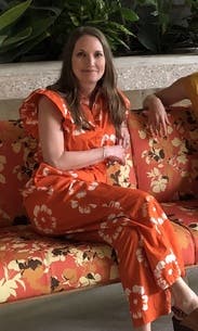 Orange floral poplin (100% Cotton). Jumpsuit. Cap sleeves. Collar. Front button closure. 55.5" from shoulder to hemline. 28" inseam. 12.5" rise. Imported.
