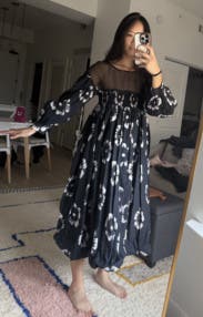 I was pleasantly surprised by how airy and flowy it fits, and comfortable in warm weather even though it’s a wide silhouette and black cotton. The hem on the rear side of the dress allows it to flow beautifully in movement and the shape is beautiful without sacrificing comfort. Compliments all day.