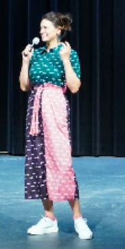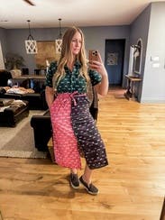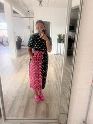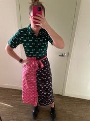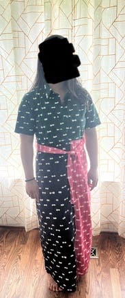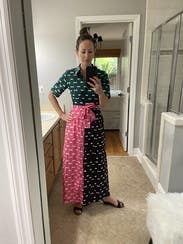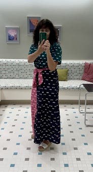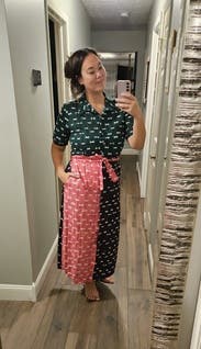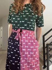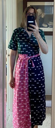 The main draw to this dress is the fabric- is is beautifully bright and highly pigmented shibori style print in jungle green, pink, and purple. Added bonus detail of brilliant green buttons. The fit was flattering, and forgiving on my hourglass frame, but overall it was a little large on me - the torso a little long, shoulders a little wide, and length was ankle length on me. I loved the wide sash- it really forgave the otherwise large fit and made the dress overall look pretty great. It is a thick, solid cotton but still kept me cool and comfortable.