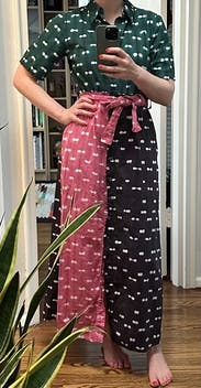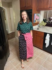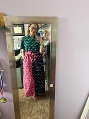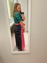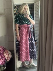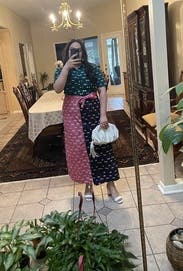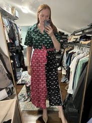 Super cute & colorful button up shirt dress. It’s all cotton with little give so I would say it’s true to size. Top is green with a navy & pink color block bottom. I’m 5’6” and the length is just above the ankles. Very comfortable and didn’t wrinkle to bad after dinner. Would rent again.