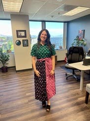 I’ve rented this dress in multiple sizes over the years and it is always seasonally appropriate for work, it is fairly straight through the hips so if you wear pear shaped size up