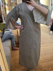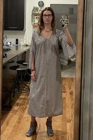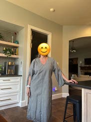 This is a caftan that can be worn as a dress or a coverup. It is loose fitting, but can be belted. It is so comfortable but it is stylish as well. You will feel like you are in your PJs but people will tell you how put together you look!