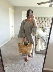 I loved the simplicity about being able to throw this dress on for school drop off, but overall it was too noisy for me! Literally…the material is a harder fabric so when you walk / move it sounds like you’re wearing a paper bag!! Also I know it’s supposed to have a looser moo moo look which I appreciate the comfort of but if you have a large chest it looks so boxy from the side view! I’d pass on this one if I had the opportunity …