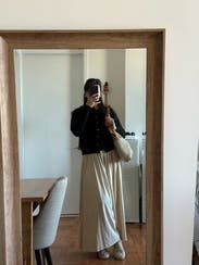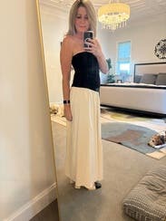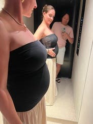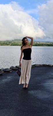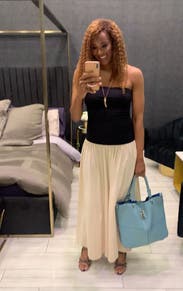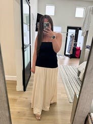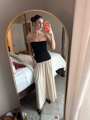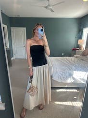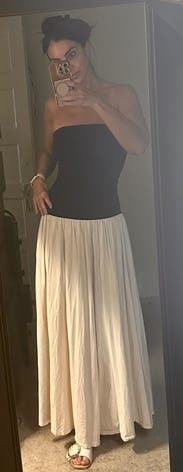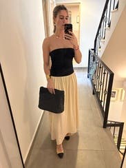 This dress is an absolute gem! The strapless black top paired with the flowing cream skirt creates such a timeless, elegant silhouette. It’s both comfortable and flattering—perfect for a growing bump or any body shape. The fabric drapes beautifully and moves with ease, making it a go-to for everything from dinners out to special occasions. A chic, effortless piece that makes you feel radiant the moment you put it on!