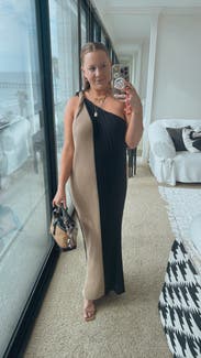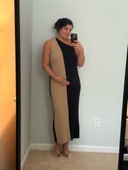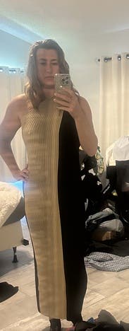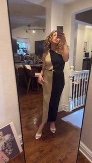 This dress was such a pleasant surprise—sleek, comfortable, and very modern. The ribbed knit has stretch, so it works well with curves and even a baby bump (I’m about 5 months pregnant here). The one-shoulder cut gives it an elevated, fashion-forward look, and the colorblock design is striking in person. The length hits mid-calf, which worked perfectly with heels, though flats would also keep it chic. Got a lot of compliments and felt stylish without sacrificing comfort. Highly recommend if you want something unique but still easy to wear.