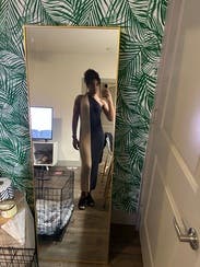 This dress was so freaking cute! Compliments all night. I’m 5’11 it’s tall girl friendly. Chose to wear this one over another really cute one because it worked better with my husband and I’s coordination. I do think that by the time I received the dress it was stretched out, and it stretched out more as the night went on. That weird stretch that takes shapes of your body when sitting, but then when you stand it’s poking out as if that body part is still there, but it’s not? Yea, weird. But overall I would rent again, I would just order a small.
