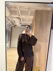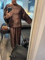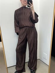 This top is so chic and comfortable! The sculptural design and boat neck opening make it a unique and interesting statement piece. The sleeves are 3/4 length and it looks great tucked into the matching pants, but would also be a cute option over a skirt or denim. Just a heads up, the boat neck opening might show your bra straps, so a strapless bra is a great option if that's a concern.