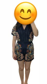 You won’t lose your mind fussing with a romper in the bathroom bc it has a zipper, so there aren’t a ton of real buttons. Eye-catching pattern. Light material, made really well. I wore it with top buttons open and bralette under, as it was snug in the chest. If you are super tall do the large.