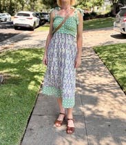 The Caballero Thandi Tribal Ink Blot Dress features a gathered bust, wide ruffled straps, and a smocked back for a flexible fit. Style it with gold hoops and a woven clutch for a casual warm-weather event.