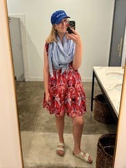 I was surprised at how many compliments I got with this dress. The color and pattern are pretty, and the fit is flattering. The fabric is synthetic but somehow was still cool and breezy for a hot day. I rented the XS and it fit fine but I think i would like to try the S to see if I like a looser fit. I wore this for every day with casual sandals.