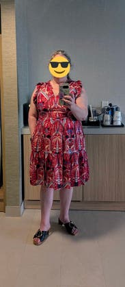 This dress has a beautiful print and soft fabric. It was a fun wear for this 62-year-old. I paired it with white sneakers and a cream-colored denim shirt. I would have liked it just a tiny bit bigger around the middle but was still comfortable.
