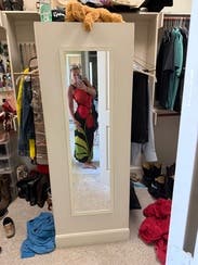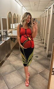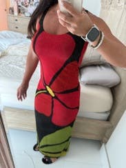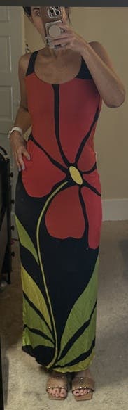There was nothing wrong with this dress, but i didn’t love it on me. Not sure why. I usually size up in stretchy dresses for a more comfy fit and this fit well, though a little big in the chest. It may have been more flattering in some ways in a small, but i also wouldn’t have felt comfortable . The open back is super fun which is a plus! But also feel like you need it more fitted to go braless. The dress was more casual than it looked in photos, which is what i was looking for, but the colors made it feel too fancy at the same time and i think where the pattern hit just didn’t flatter my body. This would be a cute vacation dress, but i struggled to think of anywhere to wear casually. And it was hard to match shows with for me.
