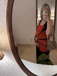 I really loved the print on this dress and rented for a Babymoon. While the material was forgiving but still fitted in a good way, I was disappointed with the actual material. It had almost a swimsuit sheen that cheapened the look for me, but still glad I tried it! The back cutout is very pretty.