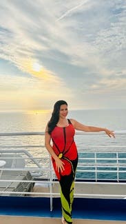 This dress is a showstopper. Vibrant colors, beautiful design. Is made of a stretchy, athletic material but looks high end and can definitely be dressed up. True to size.