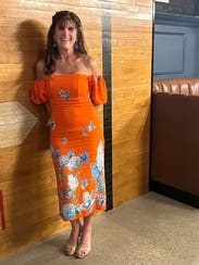 It is pretty long for my short girls, but beautiful orange color! Love the off the shoulder!