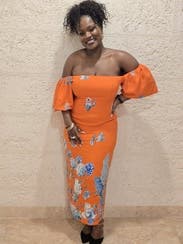 Orange floral viscose blend (96% Viscose, 4% Spandex). Sheath. Short sleeves. Off the shoulder. Back zipper closure. 42" from shoulder to hemline. Imported.
