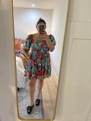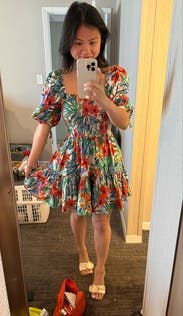 I rented this for a girls trip and wore it to dinner. It was light weight and great for a tropical environment. The sleeves can be worn on or off the shoulders and the bodice is smocked all the way around for comfort. This fit TTS for me and reminds me of hill house nap dresses.