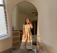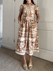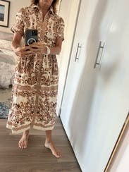If you have a large bust, sizing up will not help. I took the largest size possible because I know this brand runs small and I usually take a size 8. The waist was very snug and although I could button the front, it the gaping at the bust made it unwearable. Also the belt is attached in the back, and had it fit, I was planning on belting it with a suede belt and wearing it with boots. The belt buckle is covered in rattan, so it’s definitely a summer dress.