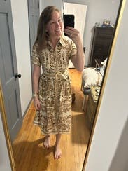 The collar makes it professional and the pattern keeps it fun. Belt is very flattering
